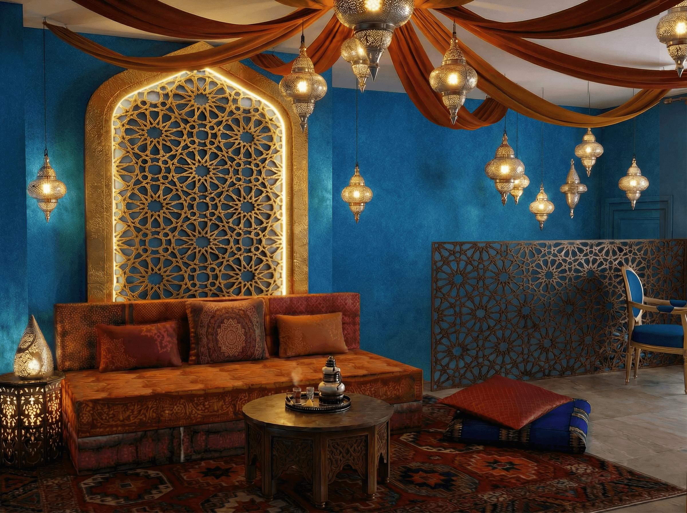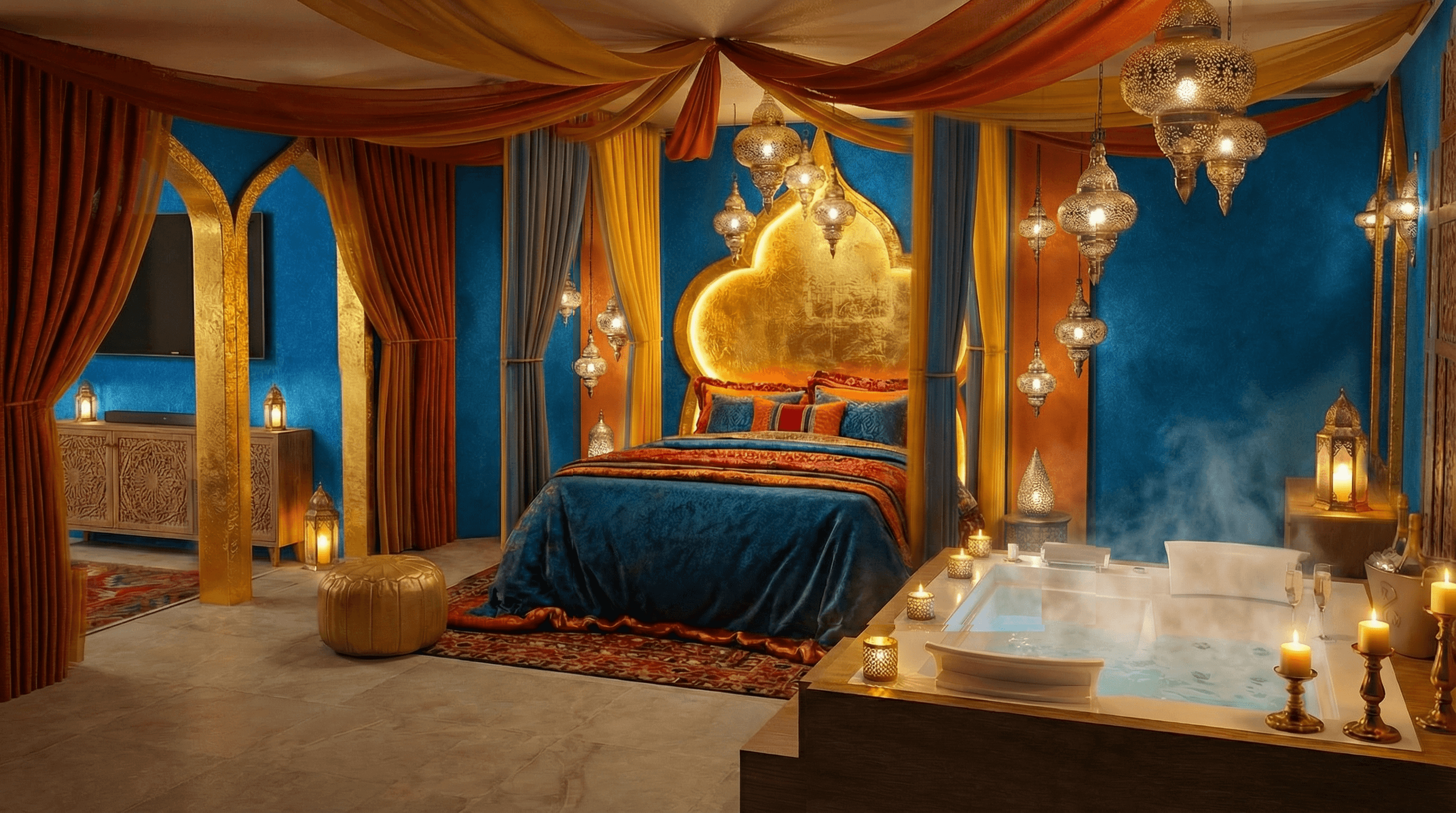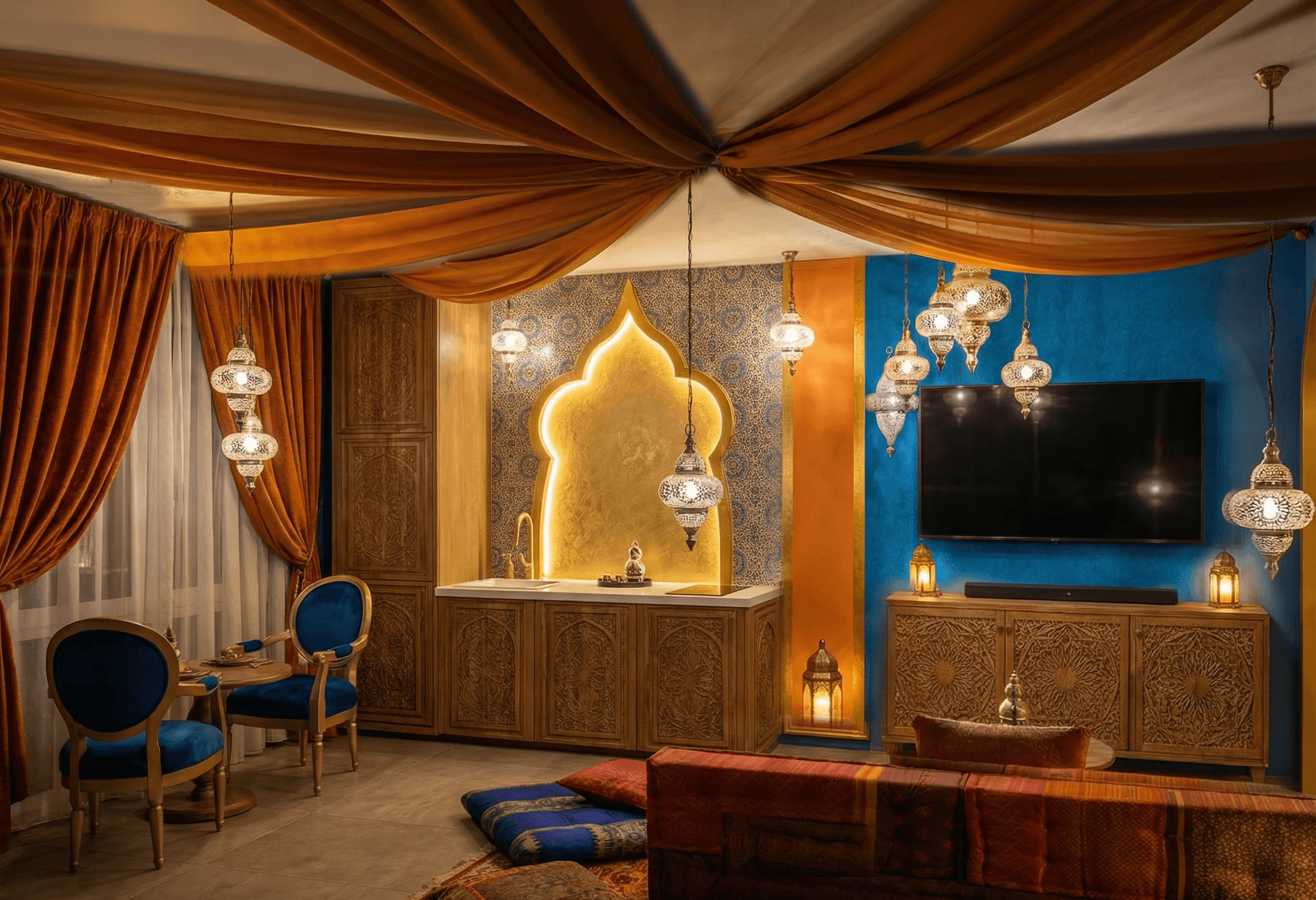 Une transformation complète d’un espace en une suite immersive inspirée de l’univers des Mille et Une Nuits. Le lieu a été pensé comme une véritable parenthèse hors du temps, mêlant richesse des matières, jeux de lumière et atmosphère orientale envoûtante.