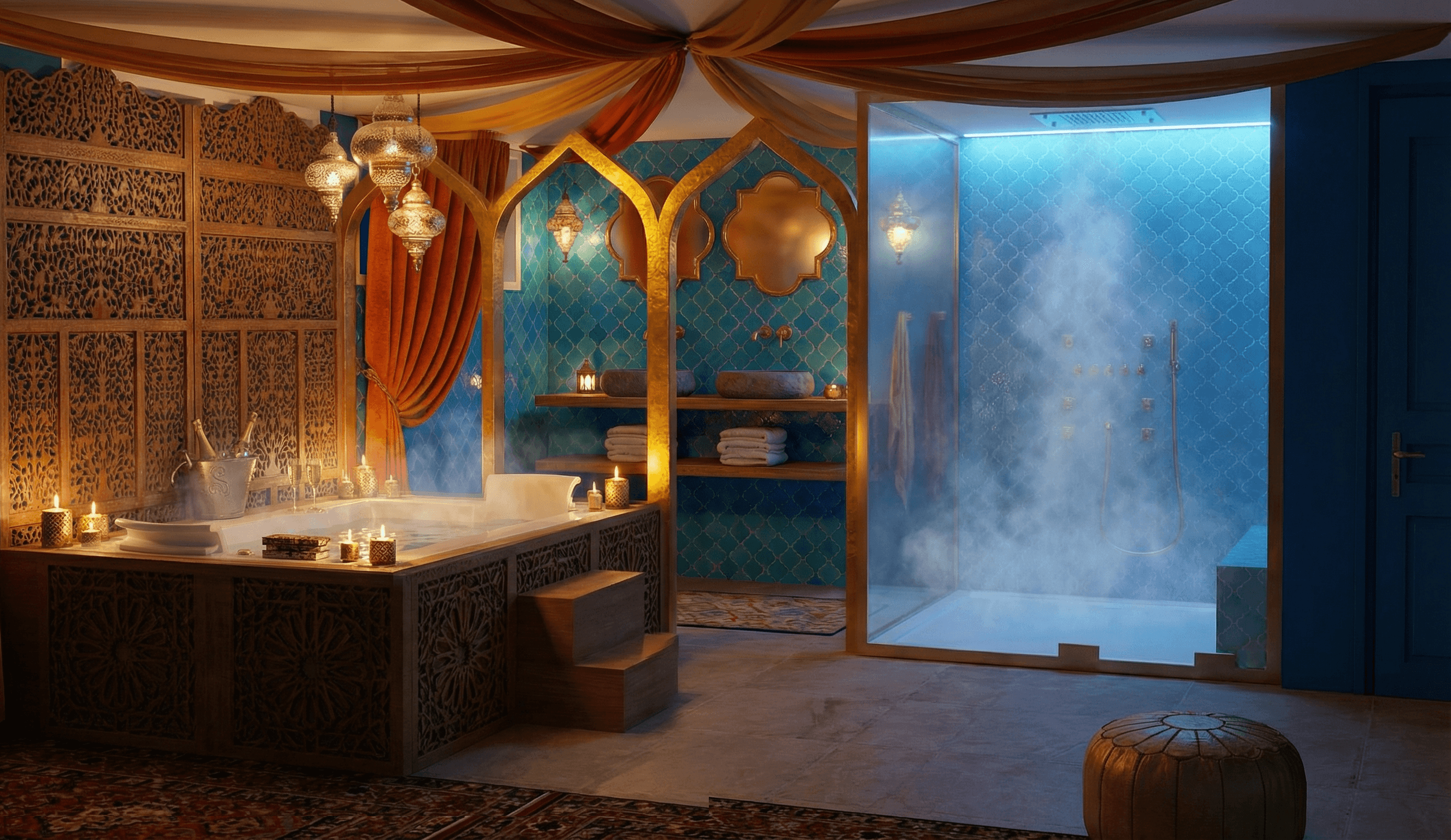 Une transformation complète d’un espace en une suite immersive inspirée de l’univers des Mille et Une Nuits. Le lieu a été pensé comme une véritable parenthèse hors du temps, mêlant richesse des matières, jeux de lumière et atmosphère orientale envoûtante.